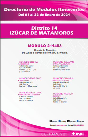 Directorio de Módulos Itinerantes 01-22/01/2024 DISTRITO 14 IZUCAR DE MATAMOROS MODULO 211453