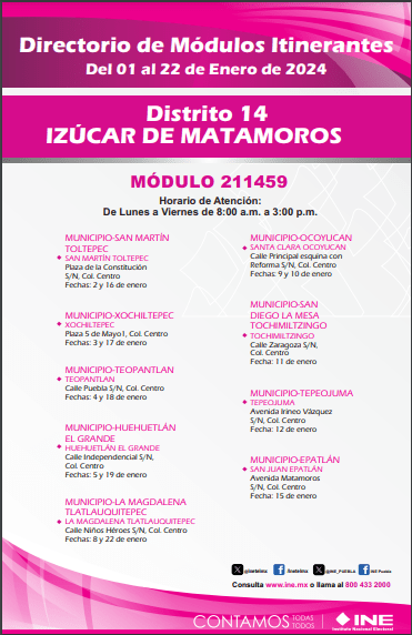 Directorio de Módulos Itinerantes 01-22/01/2024 DISTRITO 14 IZUCAR DE MATAMOROS MODULO 211459