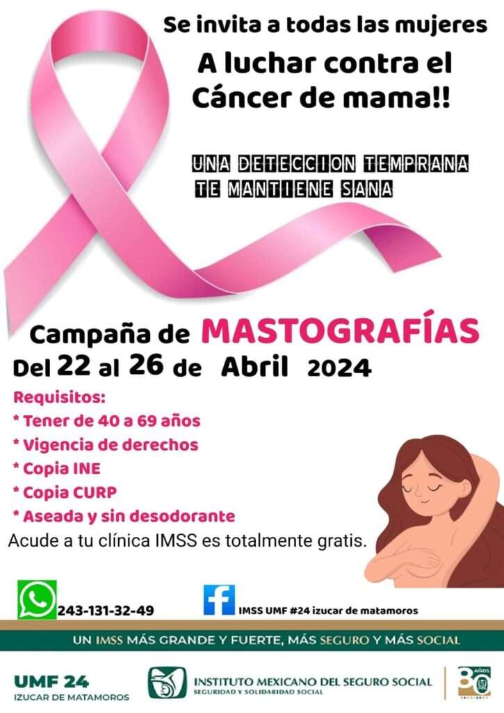 Luchemos tod@s contra el cáncer de mama❣Campaña de mastografías en el #IMSS UMF #24Del 22 al 26 de abril De 8:00 AM a 7:00 PM